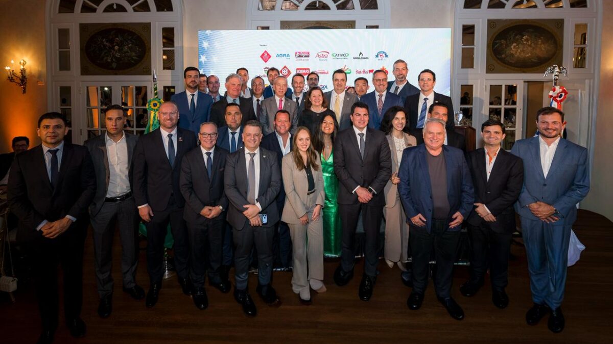 Grupo de executivos, autoridades e representantes do setor de carne bovina posando para foto oficial em um salão sofisticado, com arquitetura clássica, iluminação quente e painel de empresas ao fundo. A maioria veste ternos escuros, com algumas mulheres em destaque no centro, em uma composição institucional e formal do evento.