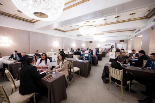 Ambiente organizado para rodadas de negócios do Brazilian Beef Connect, com mesas individuais distribuídas pelo salão, onde empresários e compradores realizam reuniões simultâneas. Participantes estão sentados frente a frente, em conversas estratégicas, com identificação das empresas nas mesas.