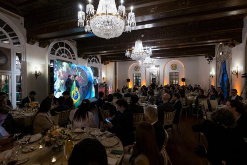 Salão amplo com jantar institucional, mesas redondas ocupadas por convidados em trajes formais, acompanhando discursos em um palco iluminado. Ao fundo, telão com identidade visual do evento e bandeiras do Brasil e dos Estados Unidos, reforçando o caráter bilateral da agenda.