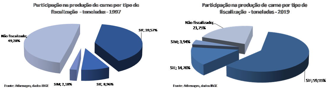 Em 2019, a proporção de carne não fiscalizada caiu para menos da metade do que era na da década de 1990. Atualmente pouco menos de 22% da carne não é fiscalizada. A tendência é que cada vez mais o abate fiscalizado aumente sua proporção no total.