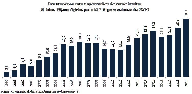 No mesmo período, as exportações aumentaram quase 12 vezes, saindo de 160 mil toneladas em 1997 para 1,86 milhão de toneladas métricas em 2019. O faturamento das exportações do setor, em dólares, saltou de cerca de US$460 milhões para US$7,6 bilhões entre 1997 e 2019.